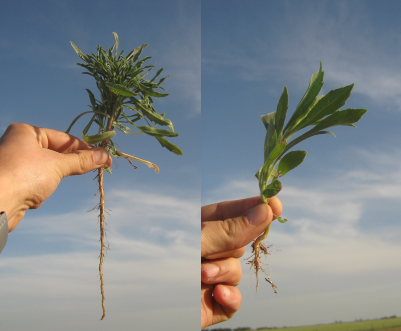 Si bien es una característica común de las malezas, en Conyza es muy evidente como su sensibilidad a los herbicidas disminuye marcadamente al comenzar a elongarse. El paso de roseta a elongación suele darse con el aumento de las temperaturas de fines de agosto o principios de septiembre. Aquellas plantas que germinan en esta época elongan rápidamente sin pasar por la etapa de roseta. Este comportamiento tiene implicancias para el manejo: las plantas nacidas en el otoño pasan el invierno como roseta y al comenzar a elongarse suelen tener muchas hojas y una considerable raíz, lo que requiere ser tenido en cuenta al definir los herbicidas y las dosis necesarias. Las malezas nacidas directamente en primavera no cuentan con estas estructuras, pero crecen rápidamente en altura, por lo que, con pocos días de demora puede perderse eficacia de control si no se ajusta la estrategia.