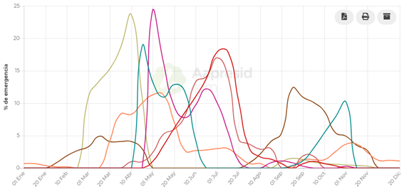 Como sabemos, Rama negra es una maleza otoño-invernal, por lo que en el otoño ocurre la mayor parte de sus nacimientos. Pero el periodo puede extenderse desde principios del otoño hasta entrada la primavera, dependiendo de la zona, las condiciones climáticas del año, el cultivo presente, etc. Este comportamiento obliga a realizar repetidas aplicaciones o, lo que es recomendable, utilizar herbicidas residuales en los barbechos que puedan controlar sucesivas camadas.