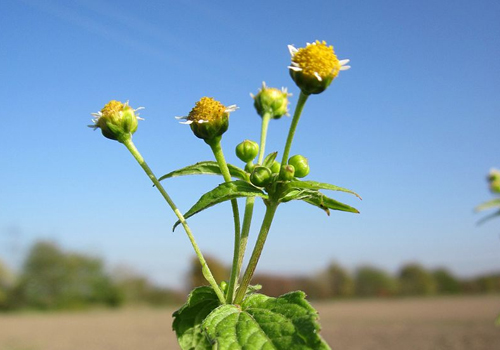 Nombre vulgar: Albahaca silvestre Nombre científico: Galinsoga parviflora Dicotiledónea Familia botánica: Asteraceae Ciclo de vida: Anual Presencia: Ampliamente distribuida Características relevantes: Planta herbácea, de porte más o menos erecto que alcanza entre 20 y 70 cm de altura. Hojas: Opuestas, con pecíolos delgados y láminas ovadas, redondeadas en la base, agudas en el ápice, levemente