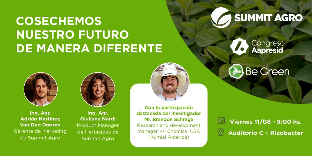 Summit Agro Argentina es una compañía que trabaja activamente para ofrecer productos de calidad que impulsen una nueva manera de concebir la protección de cultivos. La compañía, también promueve el cuidado de los recursos naturales, la protección del medio ambiente y el respeto por la calidad de vida de las personas. Por esta razón, es que invitamos a todas las personas que asistan a la edición número 31 del Congreso Aapresid, a sumarse a la charla que brindaremos el viernes 11 de agosto a las 9 hs. en el auditorio C del evento.